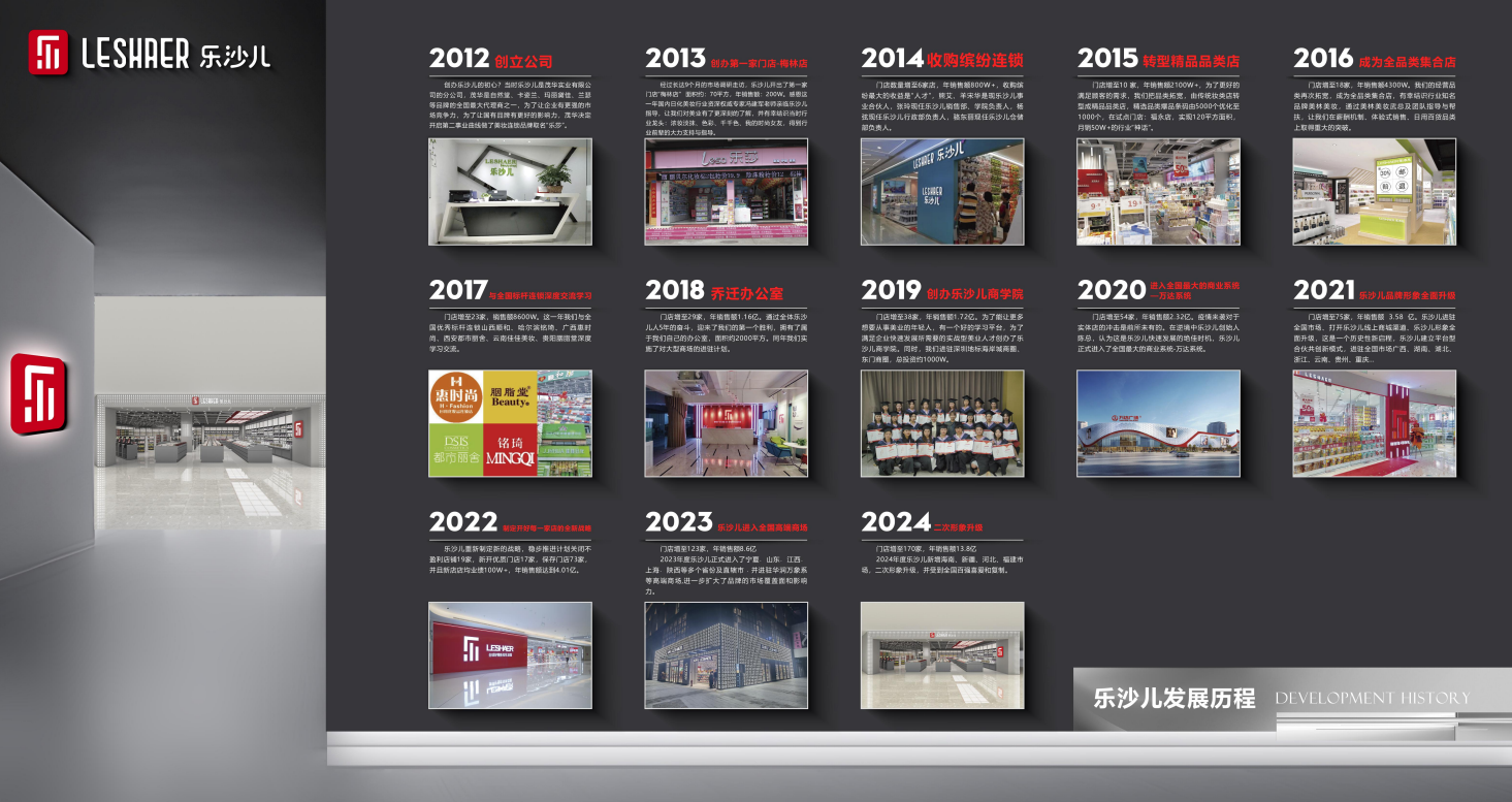 2012年乐沙儿创立,总部位于深圳宝安新安街道2019年疫情开始,正式进驻Shopping Mall(大亚湾万达店)2019-2022年 , 三年开店100+ , 2024年开店数73+